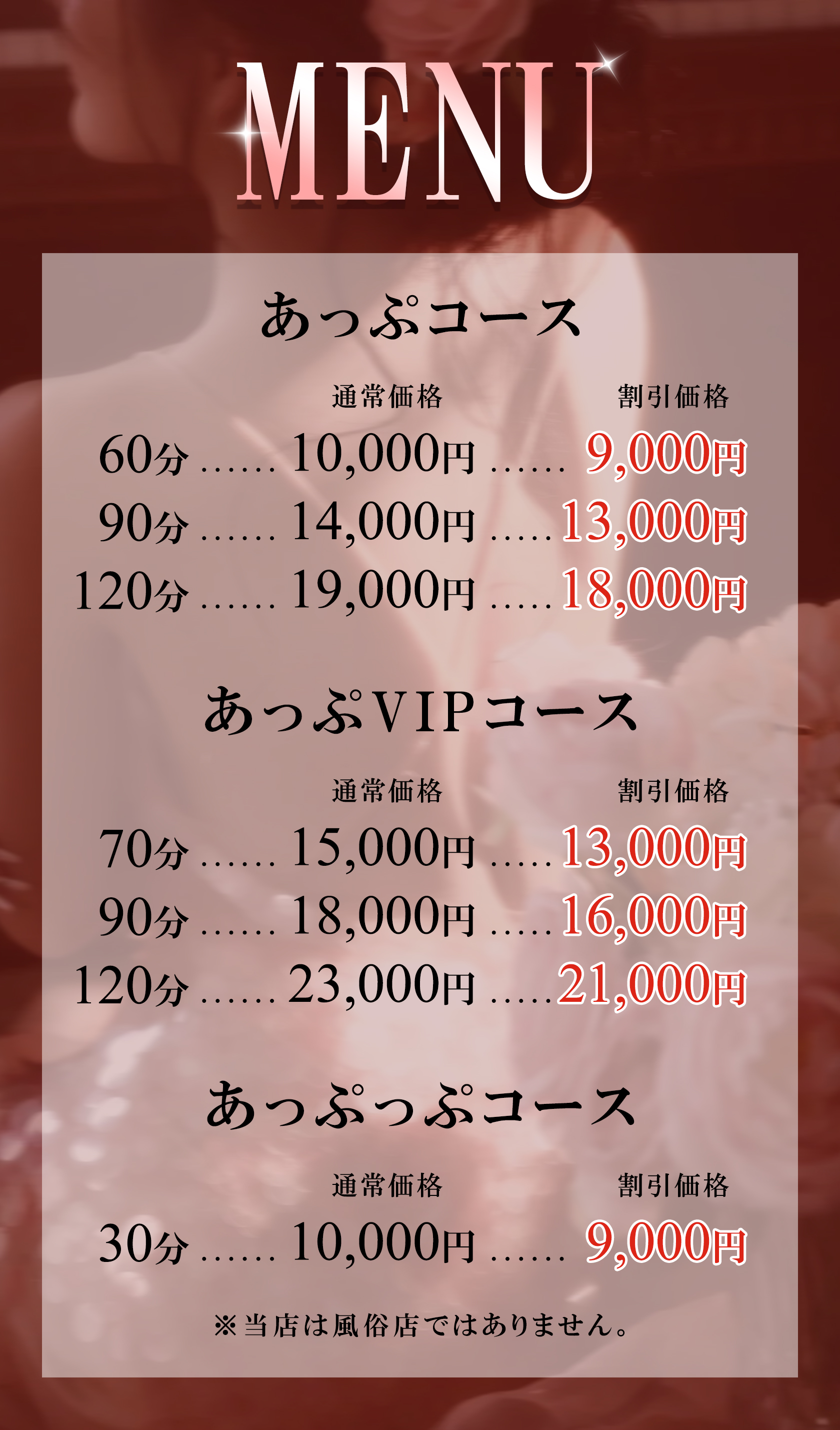 毎日頑張っている紳士の皆様、日頃の疲れになっている身体と心を、幸福なる雰囲気包まれた癒しの場所、落ちついた部屋の個室で可愛いセラピスト達がお待ちしております。当店のセラピストは若く容姿端麗にこだわりました、まるで蜜のように甘く幸せな空間でゆったりとした時間をお過ごし下さい。